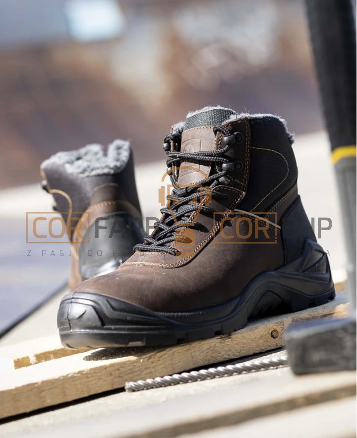 Cholewka butów została wykonana z wysokogatunkowej skóry typu NUBUCK. Materiał ten nie tylko nadaje butom elegancki, brązowy wygląd, ale przede wszystkim charakteryzuje się doskonałą odpornością na uszkodzenia mechaniczne i wilgoć. Dzięki zastosowaniu naturalnej skóry, obuwie zapewnia optymalną cyrkulację powietrza, chroniąc jednocześnie przed przemakaniem (zgodnie z normą S3).