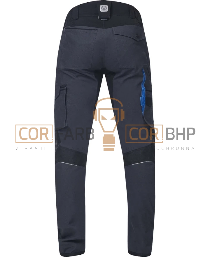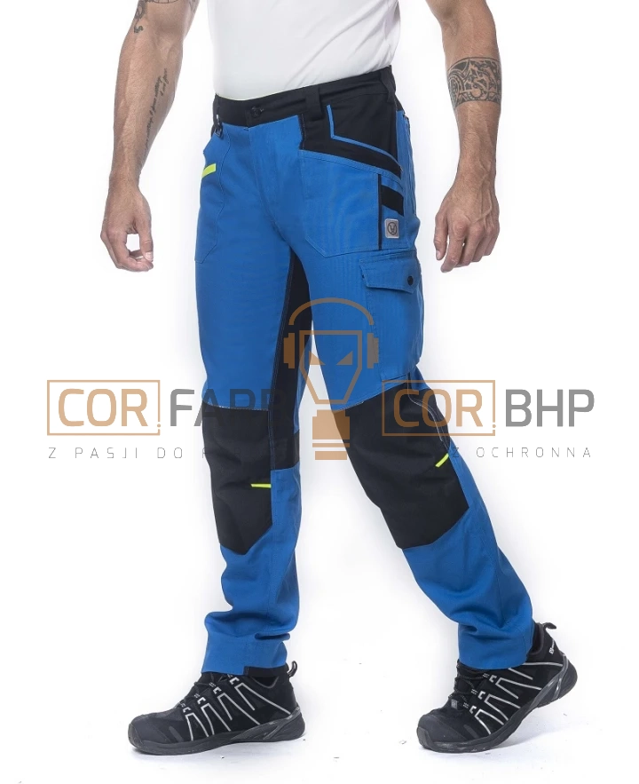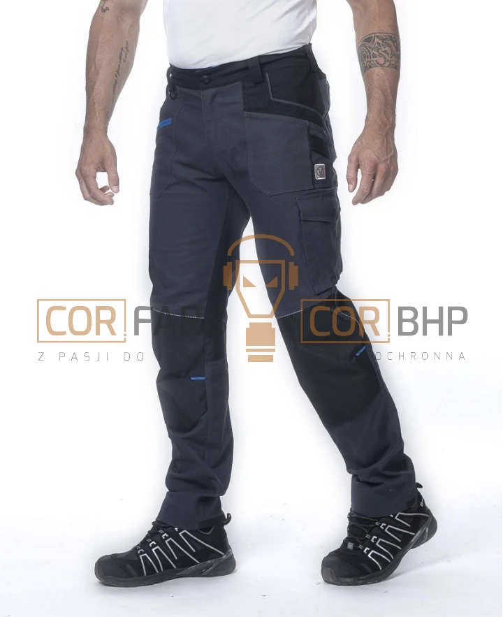 • Kieszenie funkcyjne: Wielofunkcyjna kieszeń na prawej nogawce (miarka, śrubokręt, nóż) oraz duża podwójna kieszeń z patką na lewej nogawce.