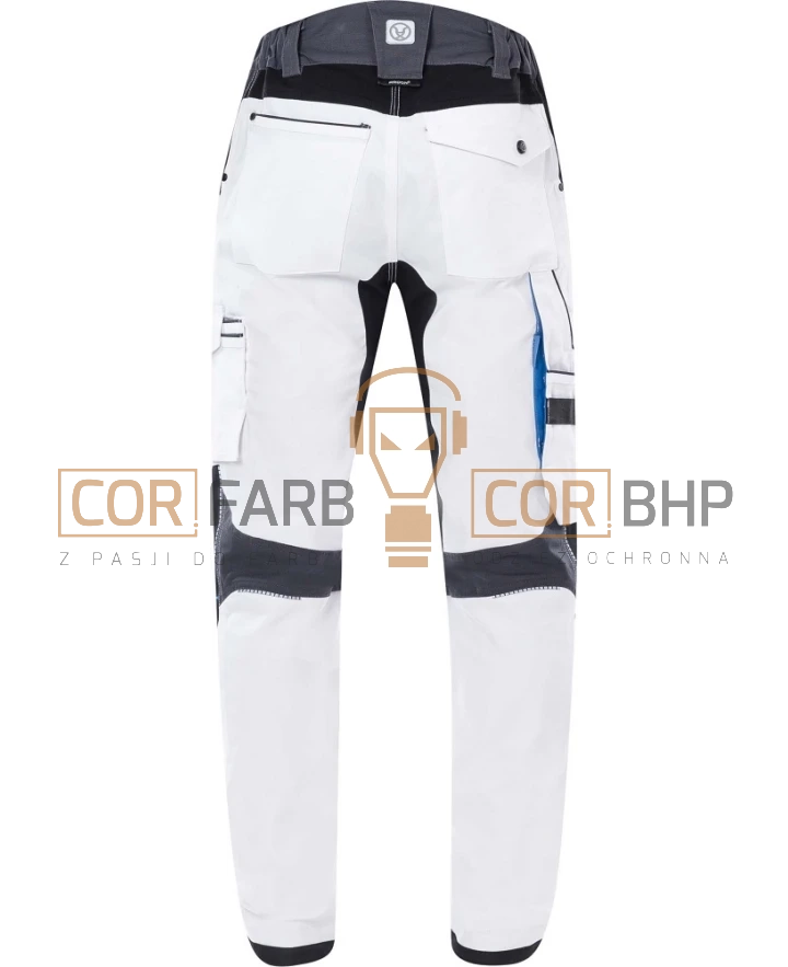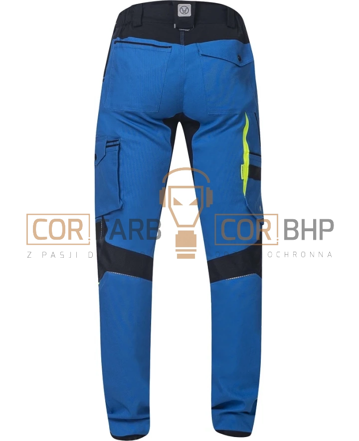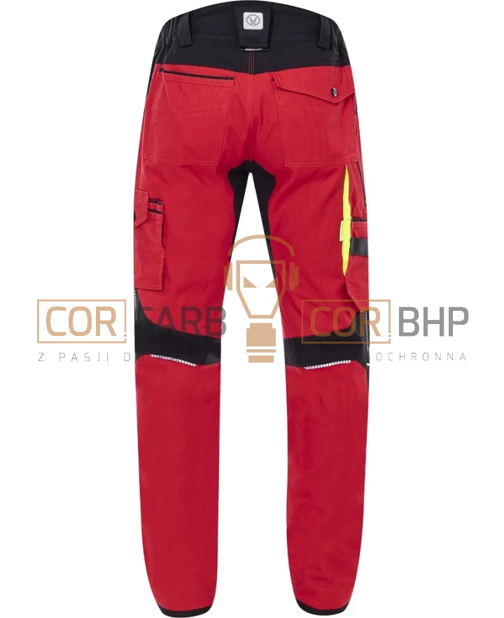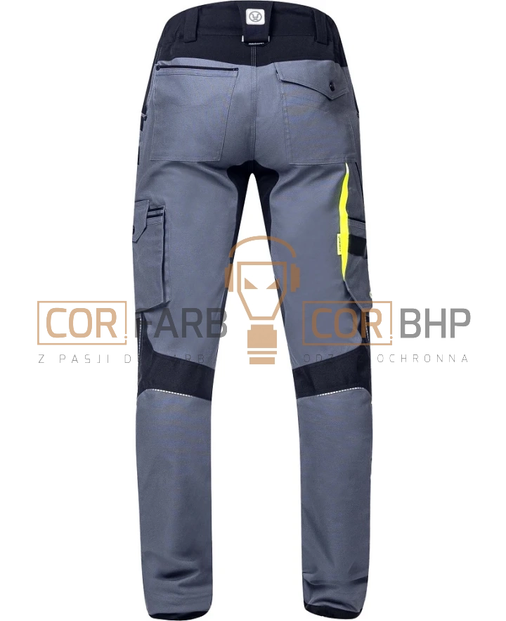 Bezpieczeństwo i trwałość Dla zwiększenia bezpieczeństwa pracy po zmroku lub w słabo oświetlonych pomieszczeniach, spodnie wyposażono w odblaskowe lamówki oraz elementy odblaskowe z przodu i z tyłu. Dolna lamówka nogawek została wzmocniona materiałem Oxford, co zapobiega ich przecieraniu się od obuwia.