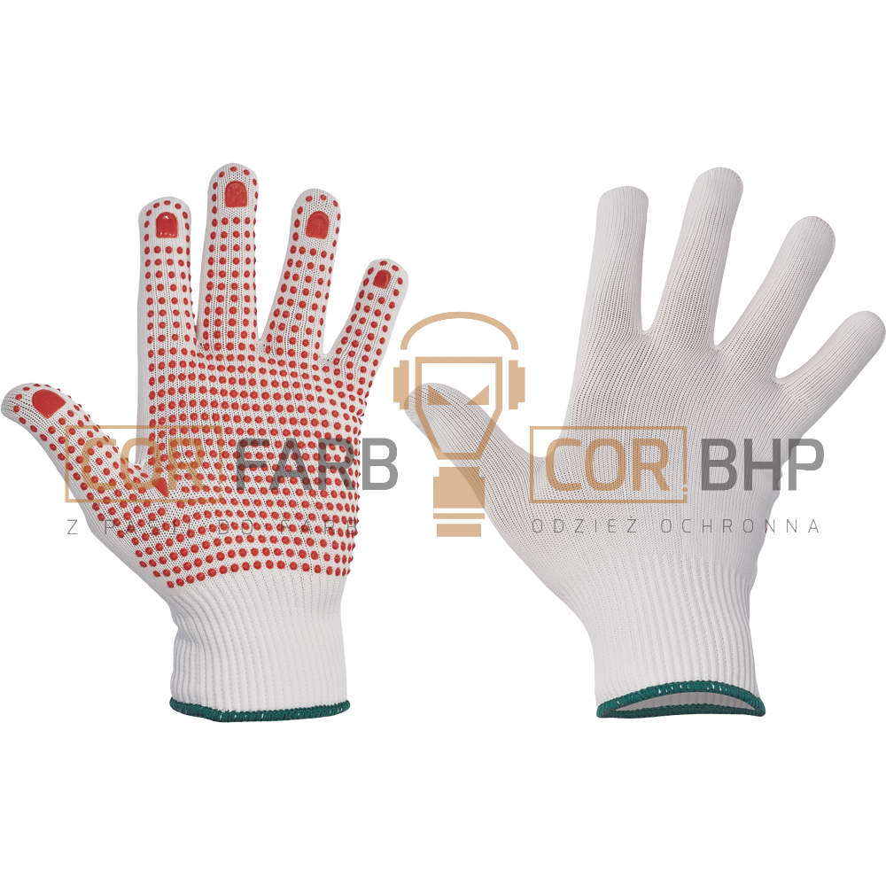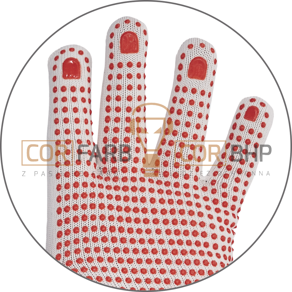 Nakropienie PCV: Specjalistyczne kropki z polichlorku winylu umieszczone w części chwytnej dłoni oraz na palcach znacząco zwiększają przyczepność. To kluczowe przy przenoszeniu gładkich lub śliskich przedmiotów.