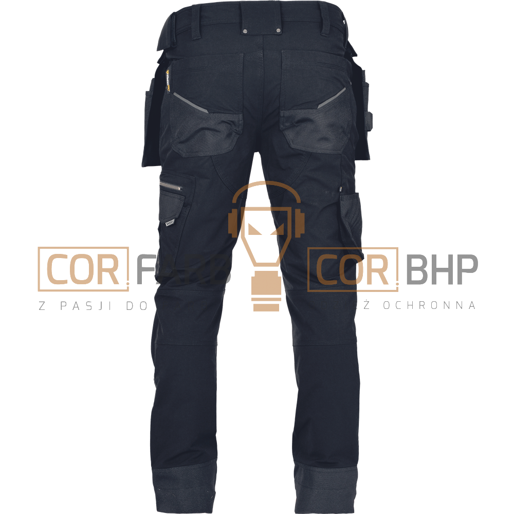 • Liczne kieszenie: 2 przednie, 2 tylne zapinane patką na rzep, duża, wielofunkcyjna kieszeń na lewym udzie oraz specjalne kieszenie na linijkę i nóż na prawym udzie.