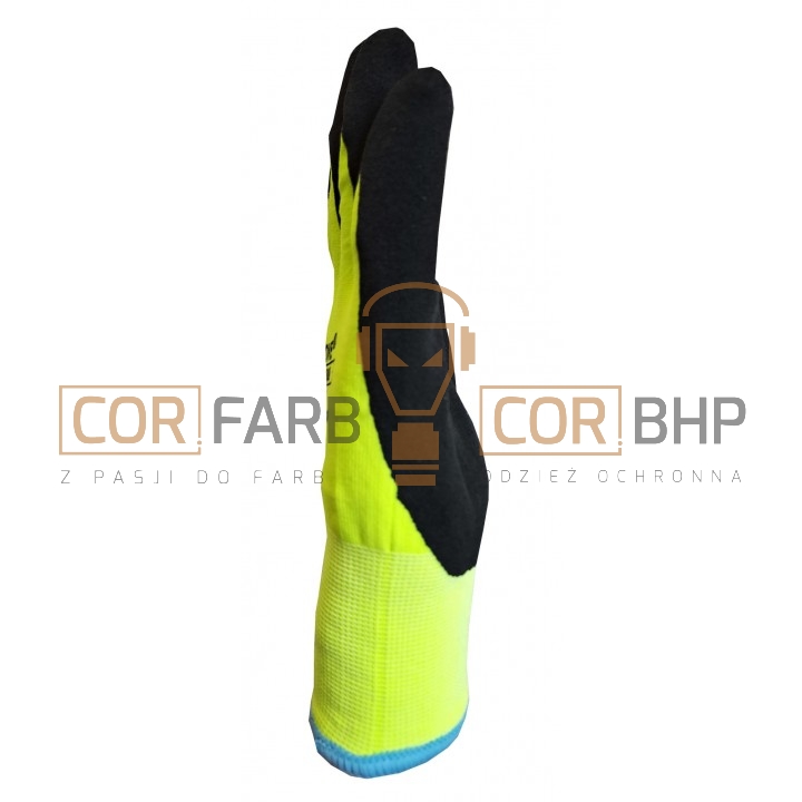 Powlekanie: Powłoka z spienionego lateksu typu SANDY FINISH w kolorze czarnym. Ta szorstka struktura zapewnia pewny i stabilny chwyt zarówno w suchych, jak i lekko wilgotnych warunkach.