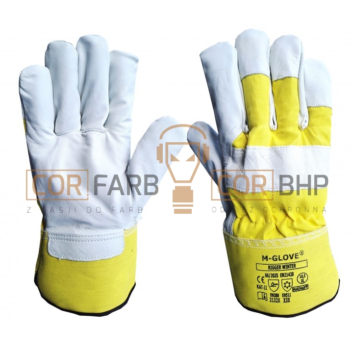 Rękawice ochronne typu rigger w wersji zimowej, wykonane z wysokiej jakości żółtej tkaniny drelichowej, wzmacniane białą skórą licową. Zapewniają wytrzymałość, komfort noszenia i ochronę w niskich temperaturach. Posiadają sztywny, podgumowany mankiet dla lepszego dopasowania i bezpieczeństwa.