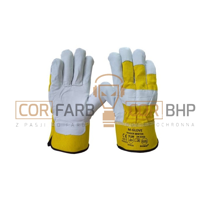 Kolorystyka: Żółta tkanina drelichowa i biała skóra licowa, co zapewnia dobrą widoczność.