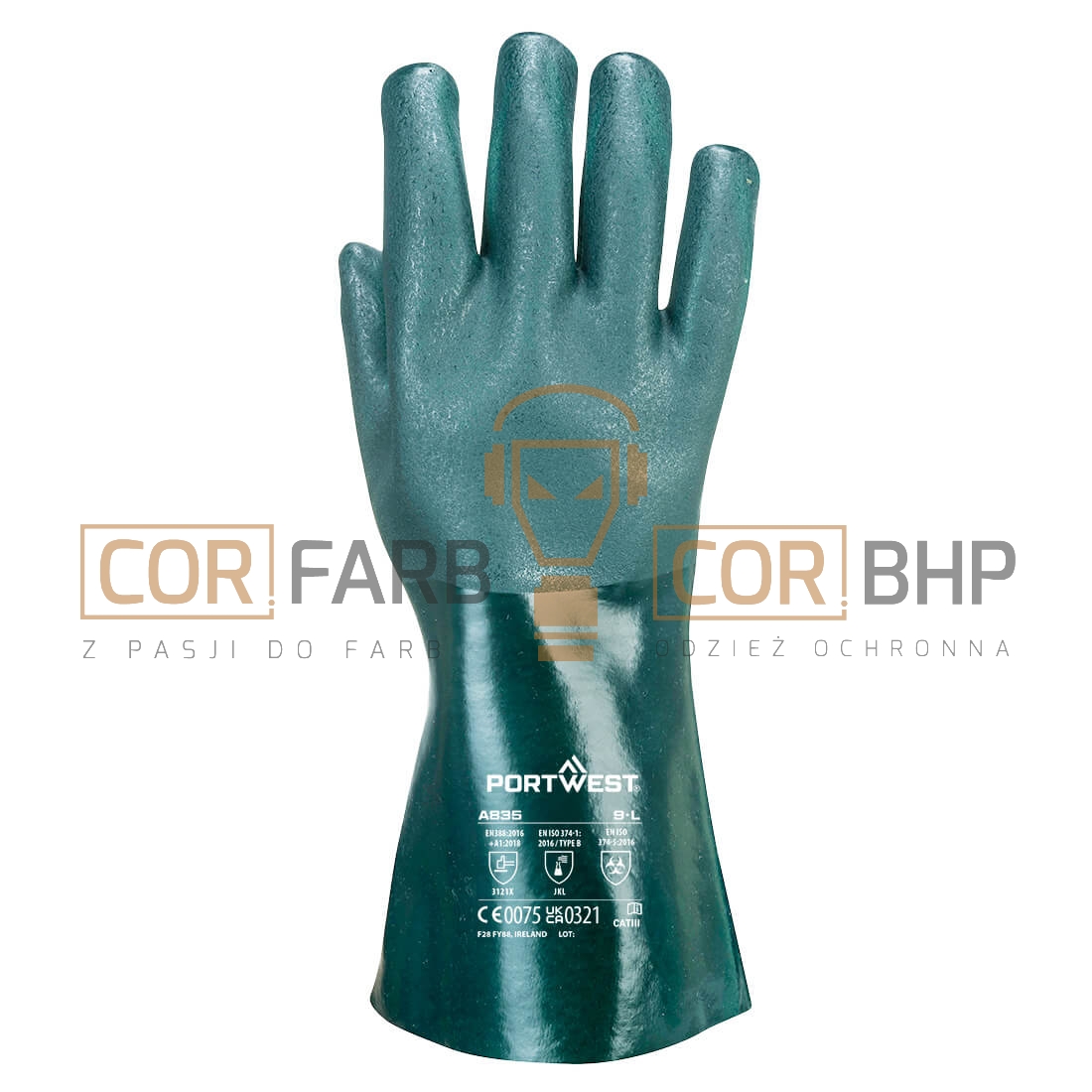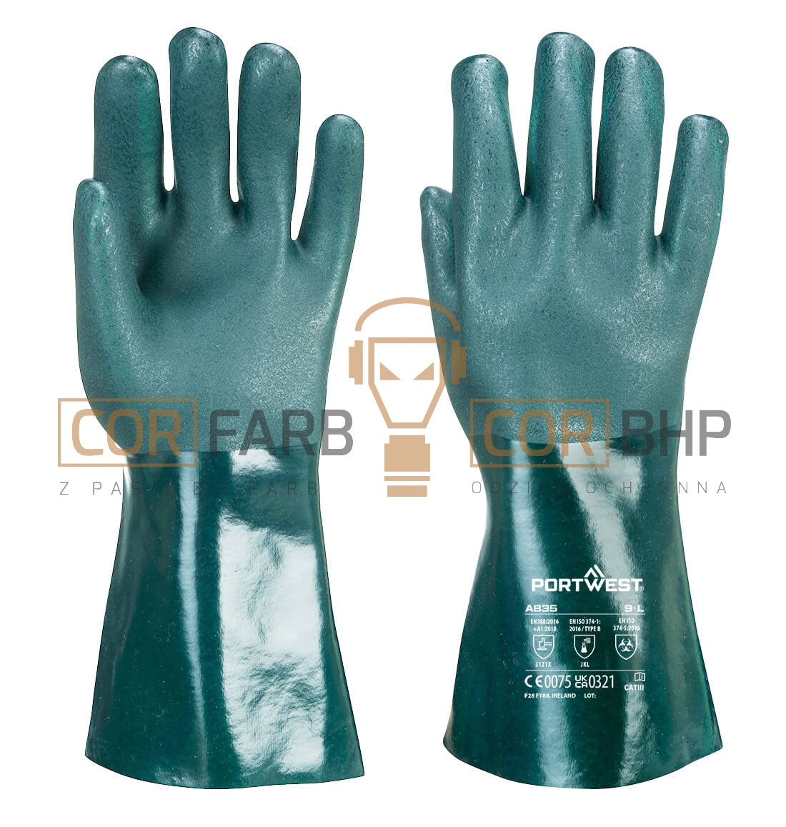 Rękawice PORTWEST A835 są w pełni certyfikowane jako środki chroniące przed zagrożeniem chemicznym.