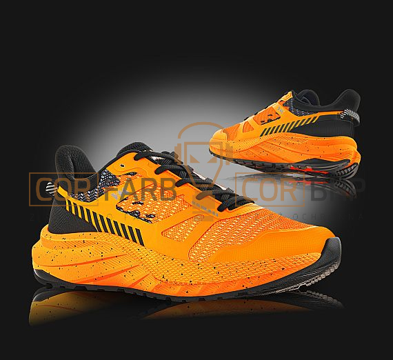 • Cholewka (Górny materiał): Wykonana z oddychającego i odpornego na ścieranie materiału tekstylnego, wzmocnionego nadrukiem TPU. Zapewnia to doskonałą wentylację oraz podwyższoną wytrzymałość w kluczowych obszarach.